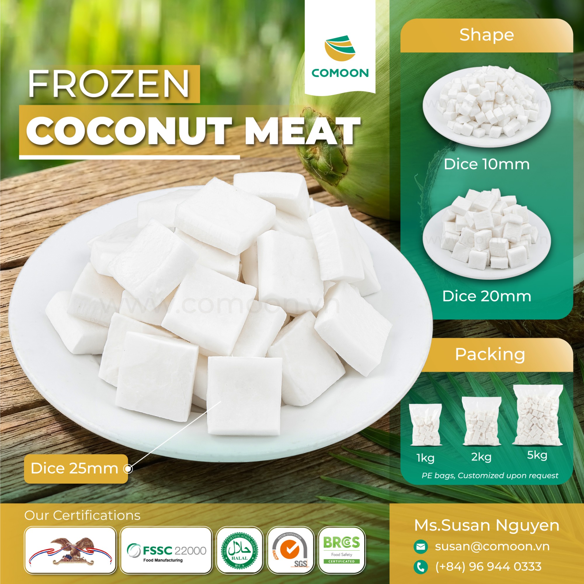 IQF Coconut Meat of COMOON is produced from high-quality coconuts sourced in Ben Tre Province, Vietnam. The coconut meat is processed and IQF quick-frozen immediately after shelling, helping preserve its natural flavor, color, and firm texture. COMOON has a supply capacity of up to 500 tons of IQF coconut meat per year. Both the product and processing facilities comply with and are certified under international standards, including BRCGS, HACCP, ISO 22000, FDA, KV, HALAL, and SMETA.