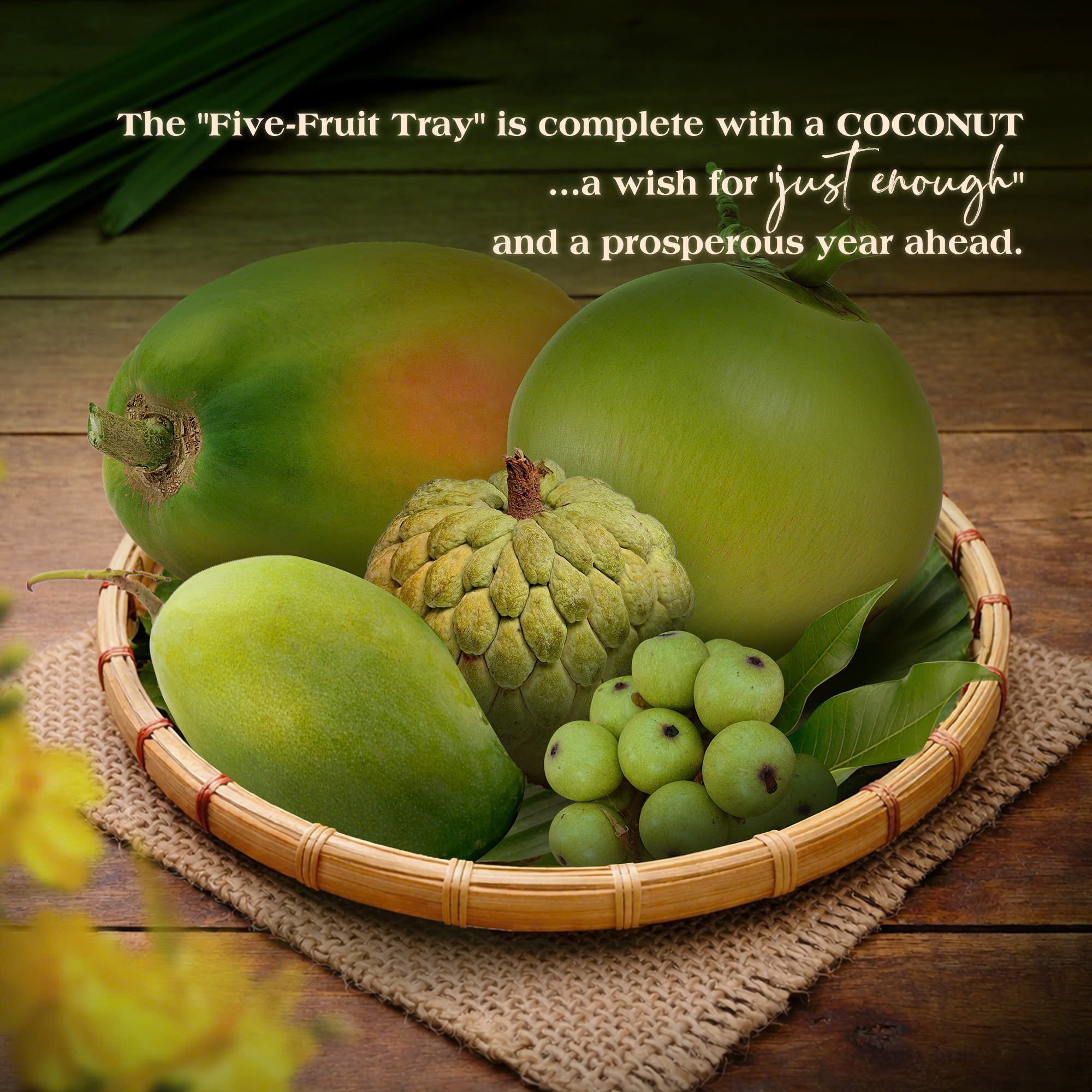 In the traditional five fruit tray of Southern Vietnam, the combination “cầu – sung – dừa – đủ – xoài” has become familiar across generations. Among these fruits, coconut conveys the meaning of “vừa” (just enough), expressing hopes for abundance, sufficiency, and a year free from hardship.
