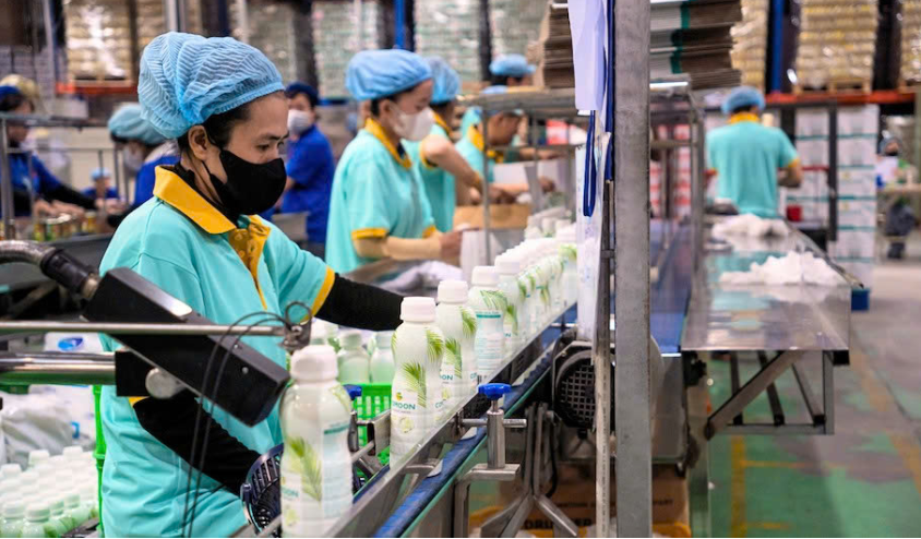 Workers on the COMOON coconut water production line at the factory, adhering to hygiene and food safety standards