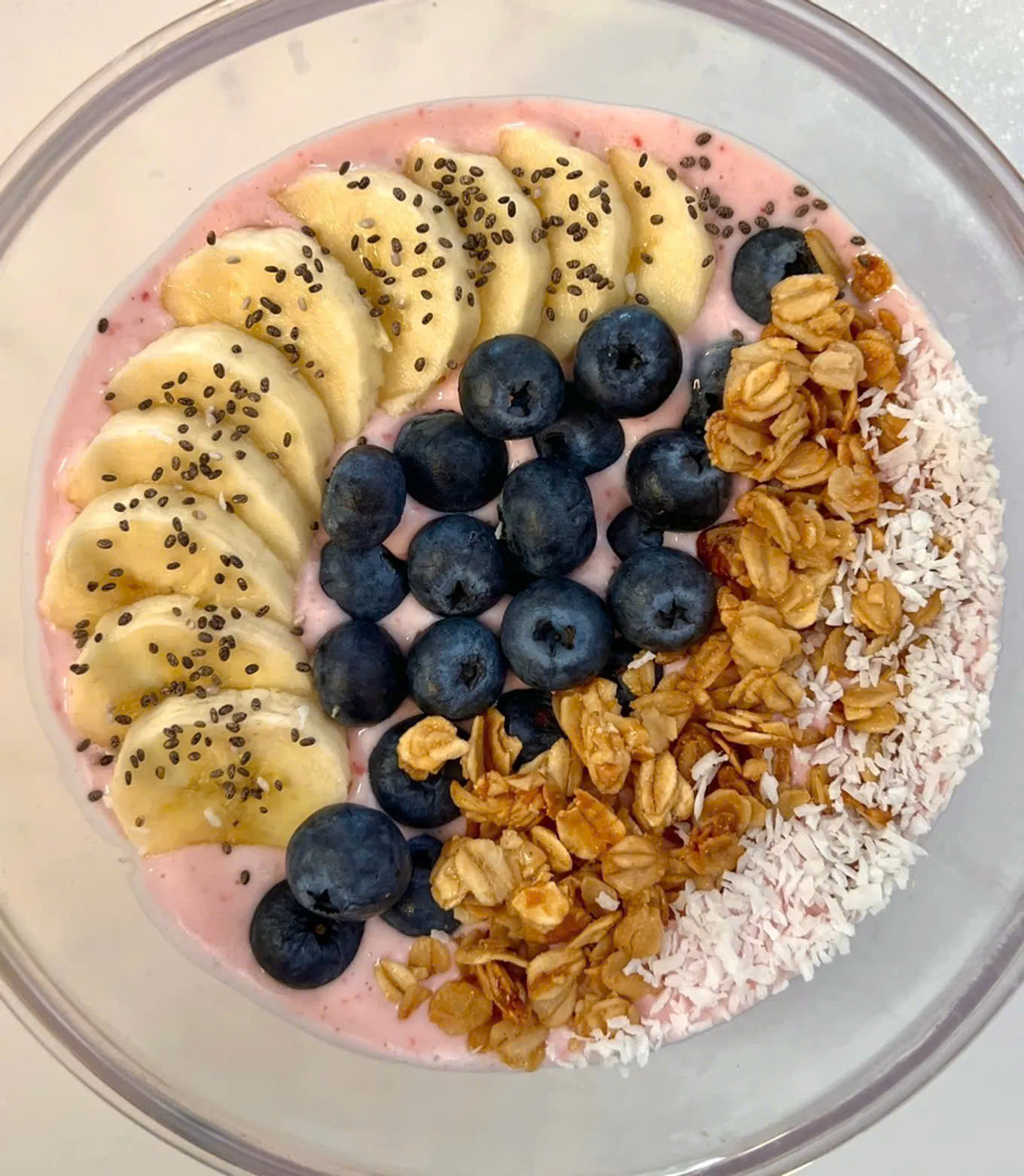 Trộn cơm dừa sấy với sữa chua không đường, có thể thêm trái cây như chuối hoặc dâu để tăng hương vị và chất xơ.