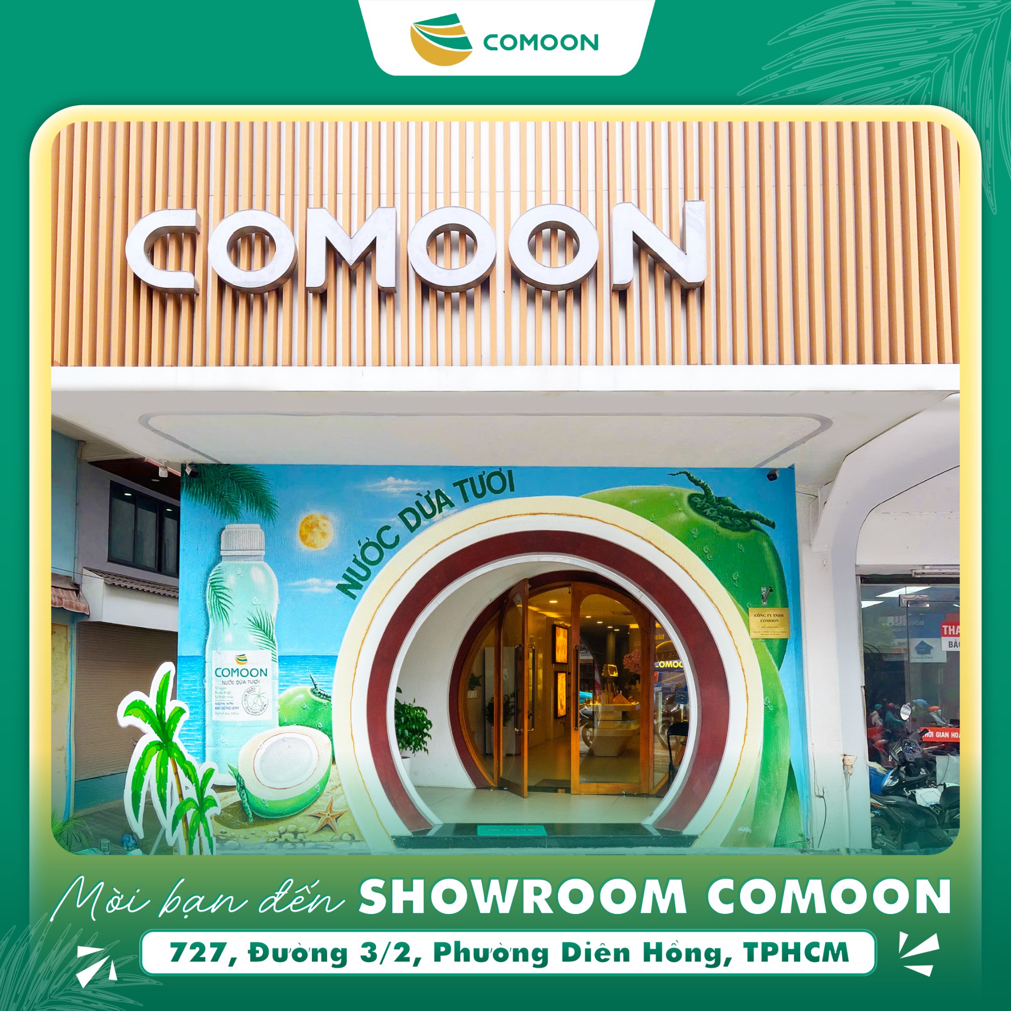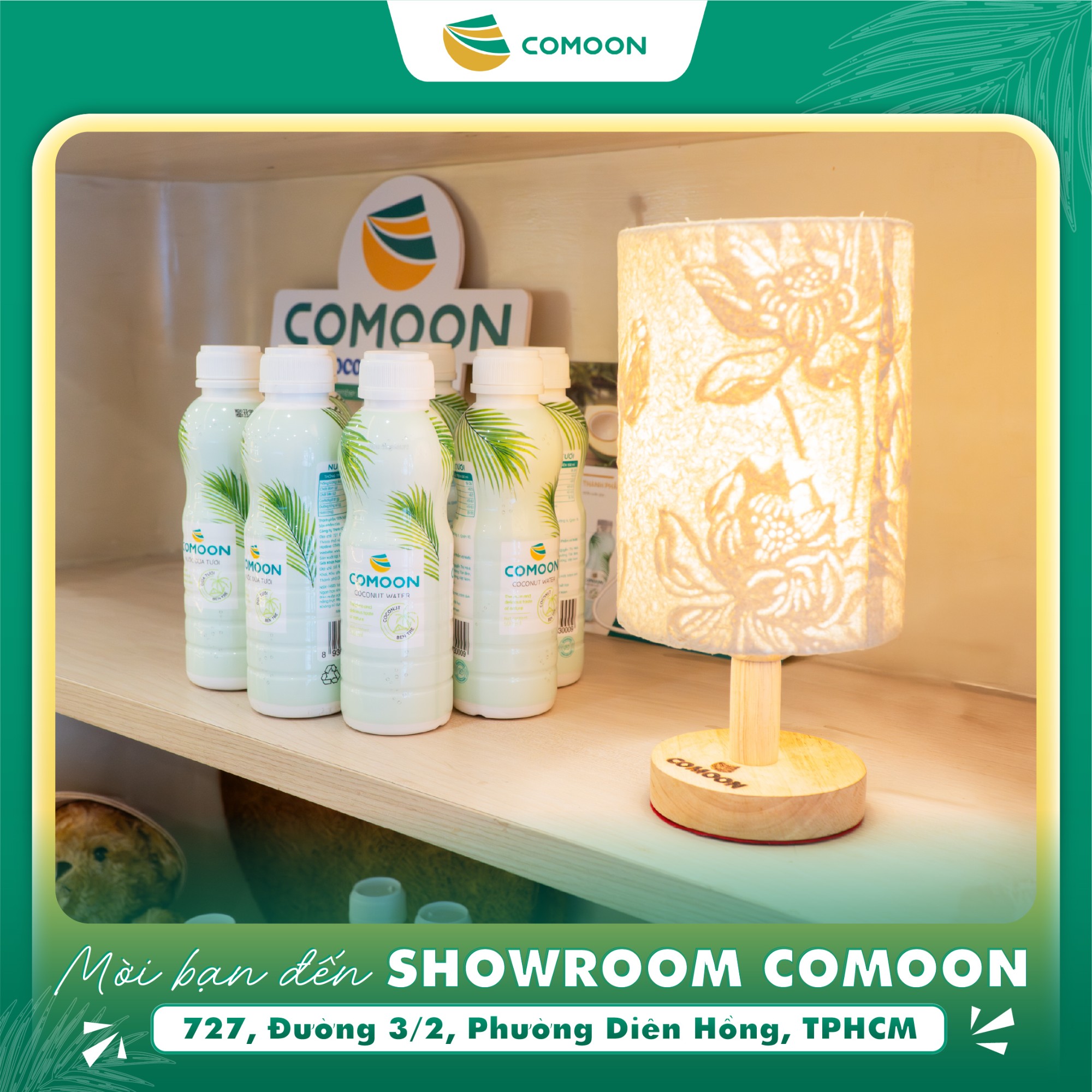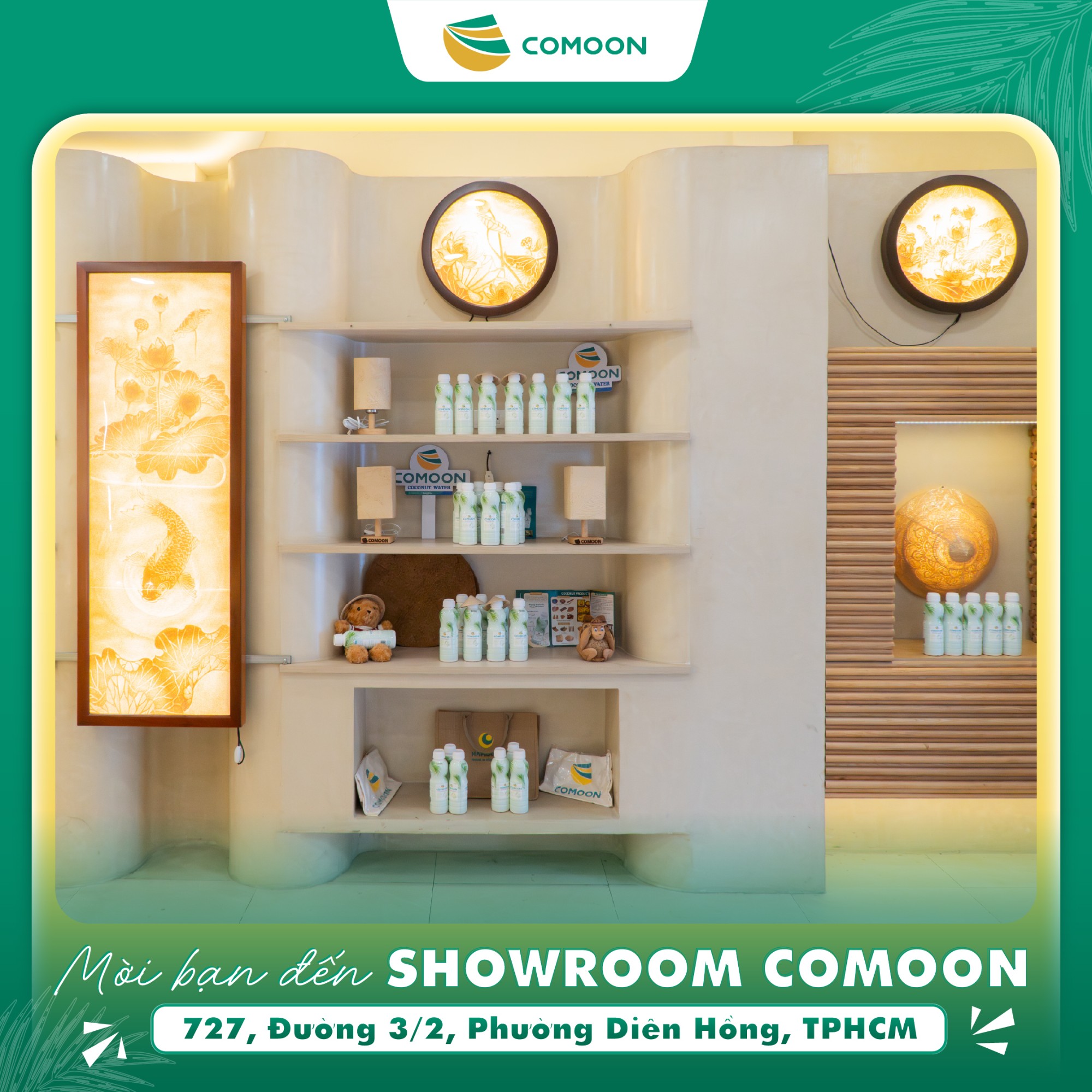 Showroom Công ty TNHH COMOON (COMOON) tại số 727, Đường 3/2, Phường Diên Hồng, TPHCM vừa có diện mạo mới: hiện đại, sinh động, nhưng vẫn giữ trọn nét gần gũi, ấm áp. Lấy cảm hứng từ hình ảnh cây dừa Việt Nam, showroom COMOON là điểm mua sắm lý tưởng các sản phẩm nước dừa đóng chai, nến gáo dừa, đồ chơi từ gáo dừa, tranh giấy dừa, sản phẩm thủ công mỹ nghệ dừa....