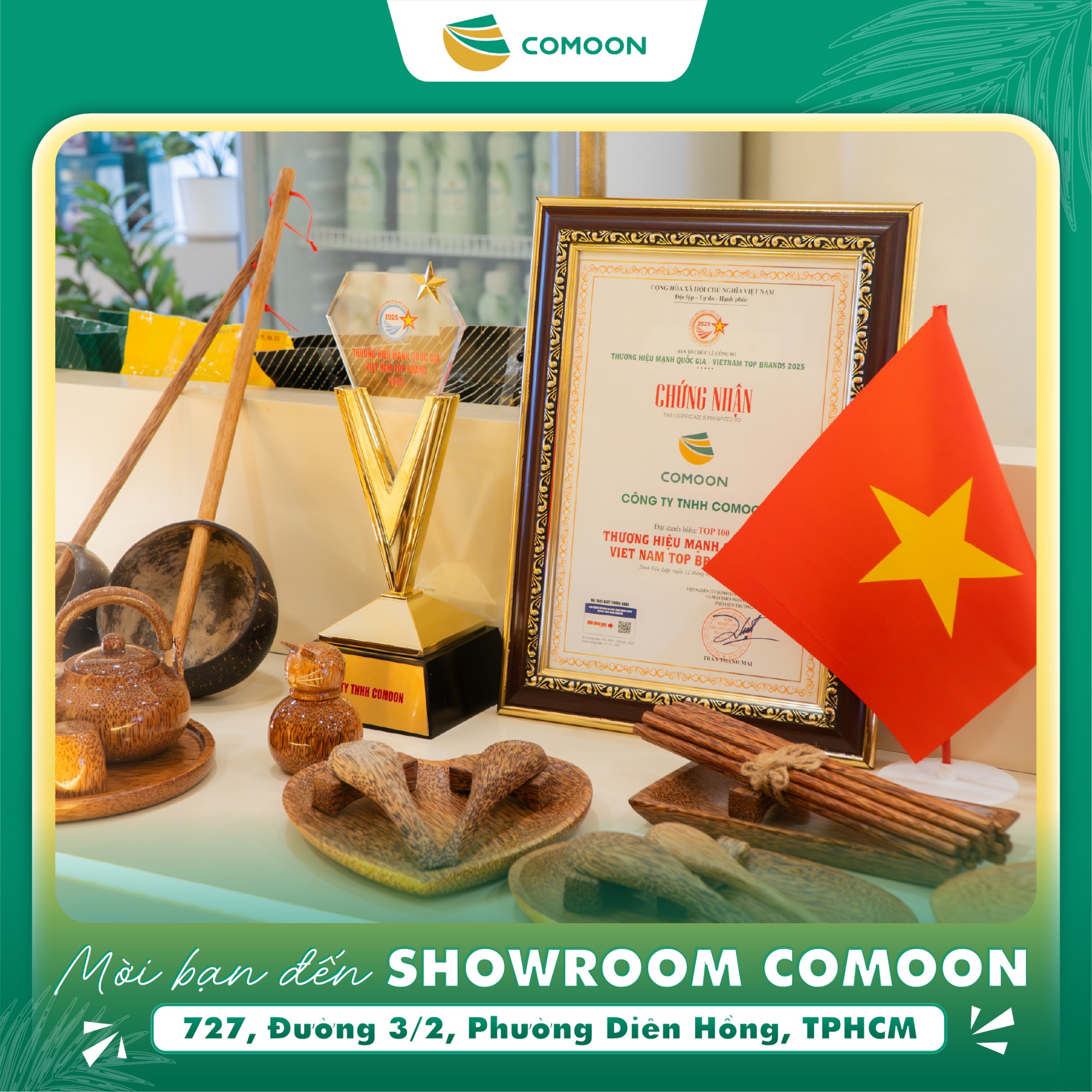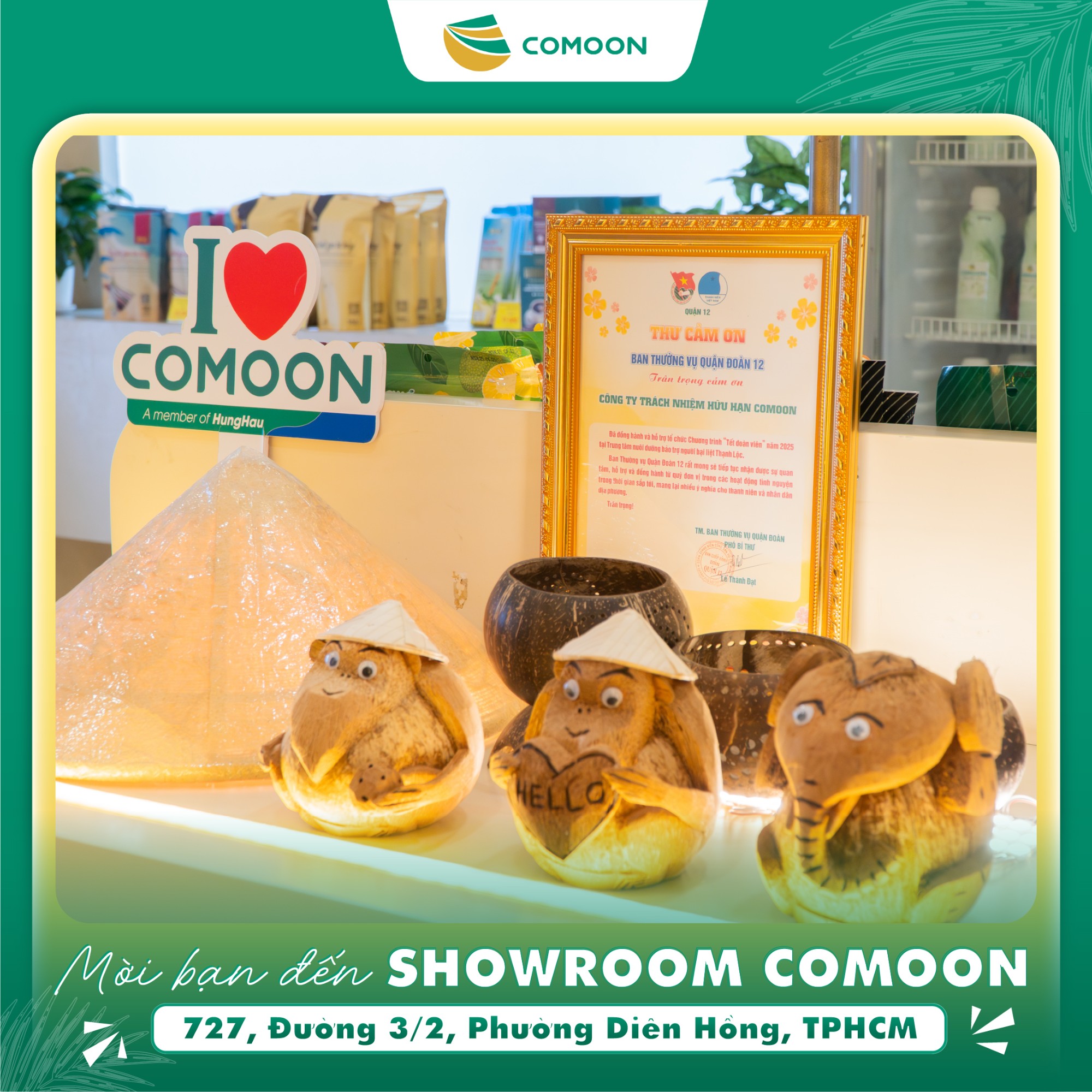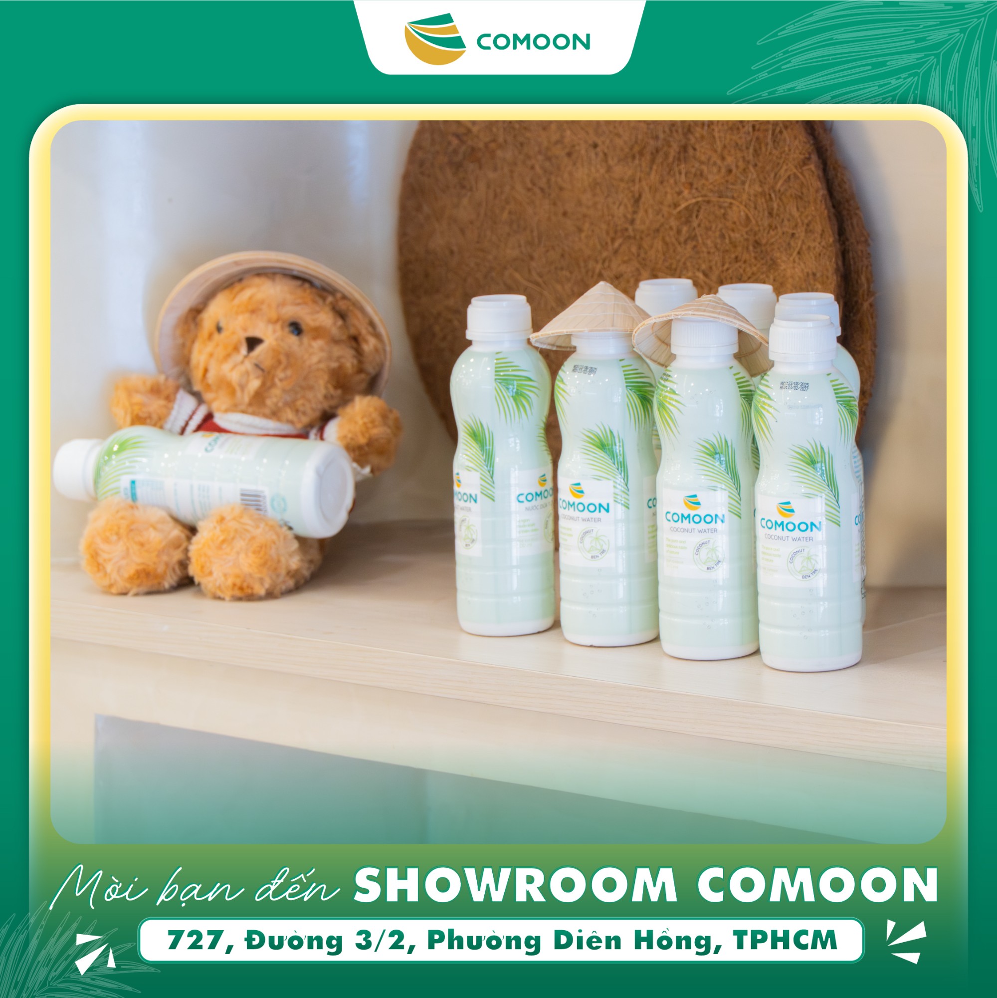 Showroom Công ty TNHH COMOON (COMOON) tại số 727, Đường 3/2, Phường Diên Hồng, TPHCM vừa có diện mạo mới: hiện đại, sinh động, nhưng vẫn giữ trọn nét gần gũi, ấm áp. Lấy cảm hứng từ hình ảnh cây dừa Việt Nam, showroom COMOON là điểm mua sắm lý tưởng các sản phẩm nước dừa đóng chai, nến gáo dừa, đồ chơi từ gáo dừa, tranh giấy dừa, sản phẩm thủ công mỹ nghệ dừa....